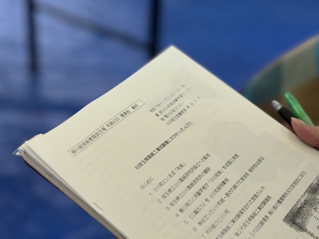 細川紙技術者協会主催による座学研修も一般公開しました。細川紙技術者協会研修員の研修施設のひとつ、小川町和紙体験学習センター(旧埼玉県製紙工業試験場)にかかわった人びとについて、小川町立図書館長 新田文子先生がお話しくださいました。一般参加のみなさまからも、新田文子先生へご質問をいただき、細川紙技術者協会 正会員・研修員と共に細川紙や小川和紙についての学びを深めました。